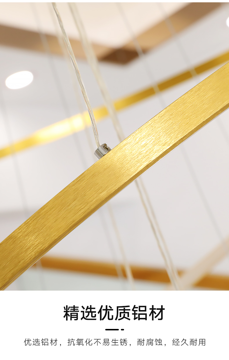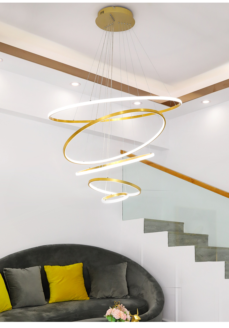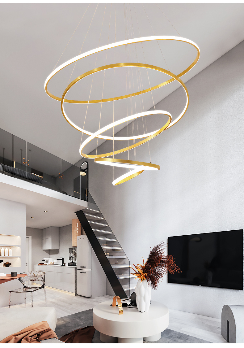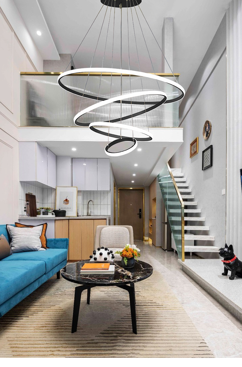 米光恵佳複式楼大吊灯客間灯現代簡約中空躍層別荘挑空loftマンション楼中楼回転階段灯長吊灯円環led吊灯黒(リモコン無極調光)四輪40+60+80+100 CM高さ2.5 m-収縮可能